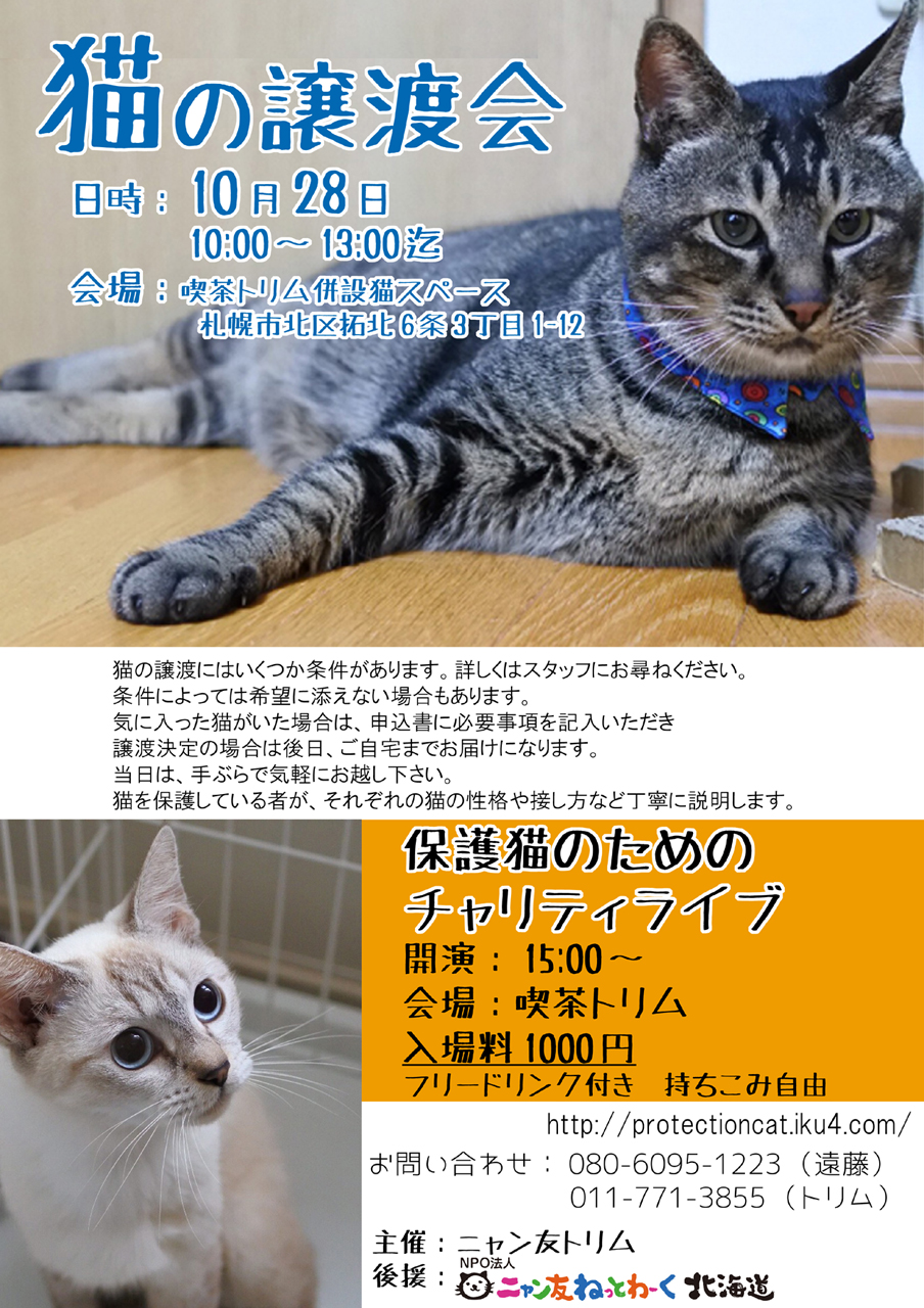 9/23譲渡会の報告 20170925 0 CM 報告が遅くなりました。9/23日の譲渡会無事終了いたしました。来場者数34名寄付金1000円決定1匹、トライアル1匹の新しいお家が決まりました。支援物資も沢山頂きました。ありがとうございます。 メンバーでわけて使わせていただきます。 次回の譲渡会は10月28日です譲渡会後はチャリティライブがあります!保存 http:// PR